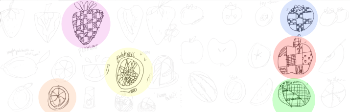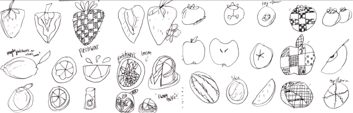Going through the sketching process, I knew I wanted to have the patchwork designs within my fruits. It became obvious that was the direction I wanted to head, so I drew fruits as differently as I could, just to see if I wanted them whole, halfed, or sliced with a pattern inside.